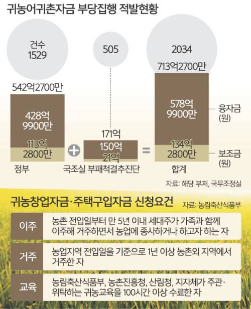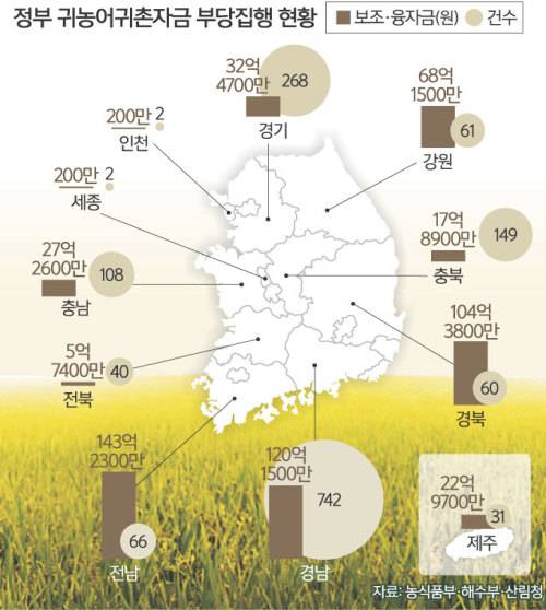 정부 귀농지원사업이 부실하게 운영되면서 농어촌에 활력을 불어넣으려는 취지를 무색게 하고 있다. 지자체들도 융자·지원금을 내세워 귀농인 유치 경쟁에만 치중할 뿐 사전심사와 사후관리가 허술해 혈세를 낭비하고 있다. 12일 농림축산식품부와 해양수산부, 산림청이 광역자치단체와 함께 전국 지자체 128곳을 대상으로 실시한 ‘귀농·귀촌 정부지원금 관리실태 감사 결과’ 자료에 따르면 전국 지원금 부정 수급 농가는 1529건에 524억2700만원으로 집계됐다. 지난해 국무조정실이 대표적 귀농지자체 8개 시·군을 대상으로 벌인 실태점검에서 적발한 505건, 171억원을 포함하면 총 2034건, 713억2700만원으로 늘어난다. 지역별로는 경남지역 부당수급자가 730건(120억1500만원)으로 전체의 절반가량을 차지했다. 수급액으로는 전남이 143억원(66건)으로 가장 컸다.