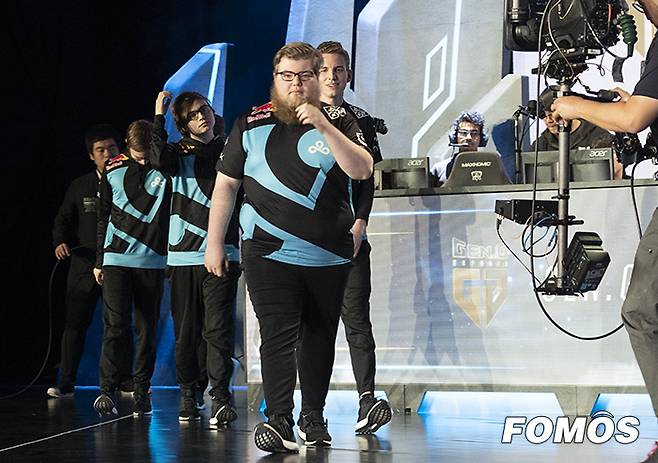 14일 오후 부산 벡스코 오디토리움에서 열린 롤드컵 그룹 스테이지 5일차 경기서 클라우드 나인이 젠지를 꺾고 2승 2패째를 기록했다. 무대 가운데로 들어오는 클라우드 나인 선수들.