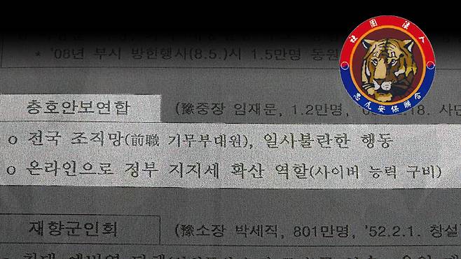 기무사령부(현 군사안보지원사령부, 이하 기무사) 퇴역군인들이 만든 친목단체 ‘충호안보연합’이 이명박 정부 당시 ‘친정부 여론조작’에 가담한 사실이 기무사 문건으로 확인됐다. 뉴스타파는 기무사가 2008~2009년 국방부 장관에게 보고한 내부 문서 3개를 입수, 이 같은 사실을 확인했다. 그 중 ‘예비역 핵심단체’라는 제목의 문건에는 “충호안보연합이 온라인으로 정부 지지세 확산 역할을 하고 있다”는 내용이 적혀 있었다.