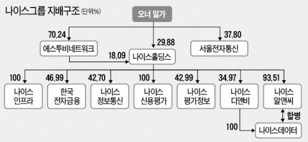 국내 최대의 개인 신용평가회사 나이스평가정보를 거느린 나이스그룹이 계열사인 나이스알앤씨와 나이스데이터를 하나의 회사로 합친다. 고(故) 김광수 나이스그룹 회장이 타계한 이후 2세 승계를 위한 지배구조 재편 작업에 본격적인 시동을 걸었다는 분석이다.