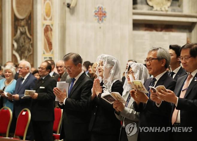 (로마=연합뉴스) 배재만 기자 = 교황청을 공식 방문 중인 문재인 대통령과 부인 김정숙 여사가 17일 오후 (현지시간) 로마 성 베드로 대성당에서 피에트로 파롤린 국무원장이 집전한 '한반도 평화를 위한 특별미사'에서 기도하고 있다. 2018.10.18