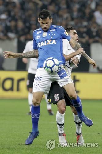 epa07101262 Ariel Cabral (L) of Corinthians vies for the ball against Gabriel (R) of Cruzeiro during the Copa do Brazil soccer match between Corinthians vs. Cruzeiro at the Corinthians Arena, in Sao Paulo, Brazil, 17 October 2018. EPA/SEBASTIAO MOREIRA