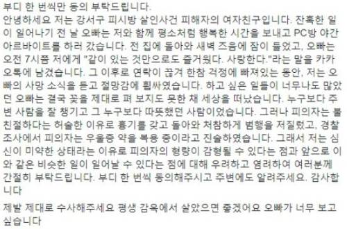 지난 17일 페이스북에는 "저는 강서구 PC방 살인사건 피해자 여자친구다"라고 주장하는 네티즌 A 씨의 글이 게재돼 이목을 집중시켰다. A 씨는 "사건 전날에도 오빠는 저와 데이트를 했다"라고 밝혔다.