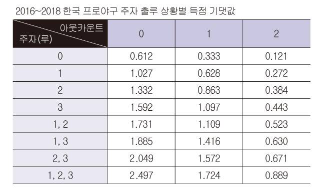 예를 들어 2016년부터 올해까지 3년간 한국 프로야구에서 끝내기 안타 등으로 이닝이 중간에 끝나지 않고 3아웃까지 모두 진행된 건 총 3만8476이닝입니다. 이 이닝에서 나온 점수는 2만3554점. 그러면 이닝을 시작할 때(무사 주자 없는 상황) 0.612점(23,554÷38,476)을 올릴 수 있을 것이라는 기대가 가능합니다.