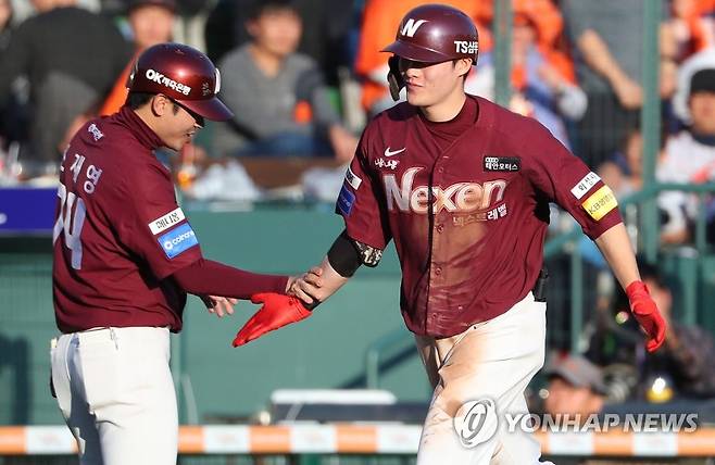 (대전=연합뉴스) 김도훈 기자 = 20일 오후 대전시 중구 한화생명이글스파크에서 열린 2018 프로야구 준플레이오프 넥센 히어로즈 대 한화 이글스의 2차전. 5회초 1사 1,2루 넥센 임병욱이 오늘 두번째 스리런 홈런을 터뜨린 뒤 조재영 코치와 하이파이브를 하고 있다. 2018.10.20