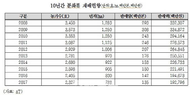 분화류 재배 농가는 2008년 3450호에서 2017년 2327호로 33%(1123호) 감소했고, 재배 면적도 1283ha에서 788ha로 39%(495ha) 줄었다.