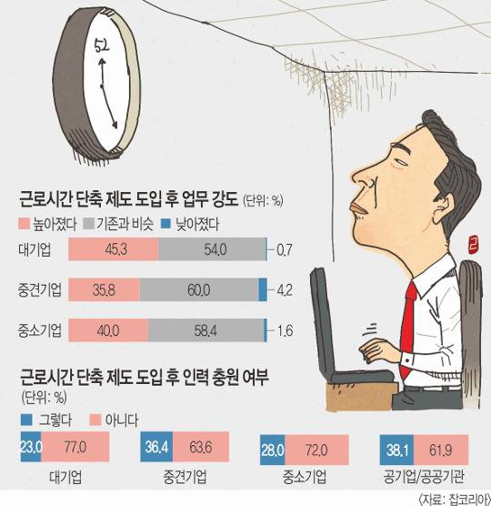 최근 잡코리아가 직장인 471명을 상대로 설문조사한 결과 ‘근로시간 단축 제도 도입 후 오히려 업무 강도가 높아졌다’는 의견이 38.0%였다. 대기업 직장인 중에는 45.3%나 됐다. 하지만 제도 시행 이후 인력을 충원한 곳은 10곳 중 3곳뿐인 것으로 조사됐다. 업무량도, 인력도 그대로인데 근로시간만 짧아져 고강도 업무를 감당해야 하는 상황이다.