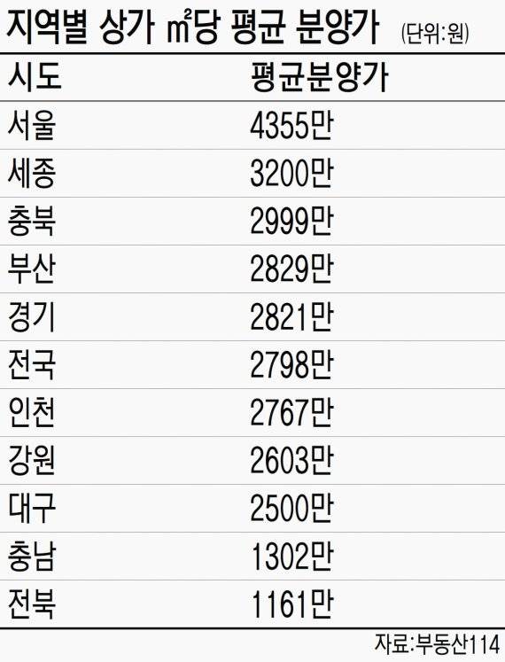 공급된 상가 평균 분양가(1층 기준)는 3.3㎡당 2798만원으로 전분기 대비 0.92% 하락했다. 시도별로는 마곡지구, 이대역, 연신내역 등 역세권 공급이 많았던 서울이 평균 4355만원으로 가장 높았다. 이어 세종 3200만원, 충북 2999만원, 부산 2829만원, 경기 2821만원, 인천 2767만원 순이었다. LH가 공급한 단지내상가는 총 6개 사업장에서 29실의 점포를 공급했다.
