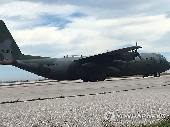 (서울=연합뉴스) 슈퍼 태풍 '위투'로 사이판에 발이 묶인 한국 관광객을 태울 대한민국 공군의 C-130 허큘리스 수송기가 27일 사이판 국제공항에 도착했다. 2018.10.27 [독자 박준호 씨 촬영 제공]