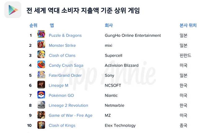 일본 게임이 역대 구글플레이 매출 순위 1, 2위를 차지했다.
