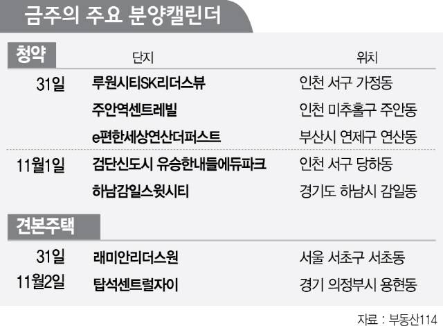 우선 SK건설이 인천시 서구 가정동에 짓는 주거복합단지 루원시티 SK 리더스뷰가 31일 1순위 접수를 받는다. 전용 75~102㎡ 2,378가구로 인천 지하철 2호선 가정역을 도보로 이용할 수 있는 역세권이다. 또 31일에는 동부건설이 분양하는 주안역 센트레빌도 청약 접수를 받는다. 47~84㎡, 총 1,458가구 중 일반분양은 578가구다. 인천 지하철 1·2호선 주안역이 도보 10분대에 접근할 수 있다.