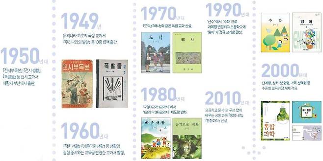 교과서 탄생 70주년 철수와 영이가 그려진 그림을 보며 국어를 배우고, 세계지도가 그려진 교과서를 보며 지리를 익히고 세계 여행까지 꿈꾸던 시절이 있다. 학창 시절 느꼈던 감정이나 당시 사회 분위기를 떠올리게 하는 것, 바로 ‘교과서’다. 학교 교육의 주요 자료인 교과서는 성인이 된 개인에게는 잊지 못할 ‘추억 책’으로, 사회적으로는 당대 시대정신과 생활상·정서가 방영된 ‘한 시대의 거울’이 된다. 1948년 대한교과서주식회사가 처음 설립되고 49년에 국정 교과서 10종 18권이 발행됐다. 국내 교과서 탄생 70주년을 맞아 연대별 교과서 특징부터 당시 시대적 배경까지 살펴봤다.