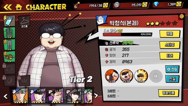 캐릭터는 강화와 진화, 레벨업, 스킬 강화 등을 통해 전투력 등 능력치를 키울 수 있으며, 상의, 하의, 핸드폰, 이어폰 등 총 6종의 장비와 의상을 장착해 추가 능력치도 부여할 수 있다.