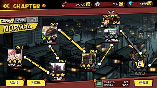 원작의 이야기를 따라가며 전투를 즐기는 콘텐츠로, 컷신이 곳곳에서 등장해 웹툰을 보는 듯한 느낌을 준다. 현재 총 12개 챕터, 252개 스테이지로 구성돼있다. 난이도는 총 3종으로, 노멀을 완료하면 하드, 엘리트 단계가 순차적으로 개방된다.