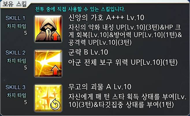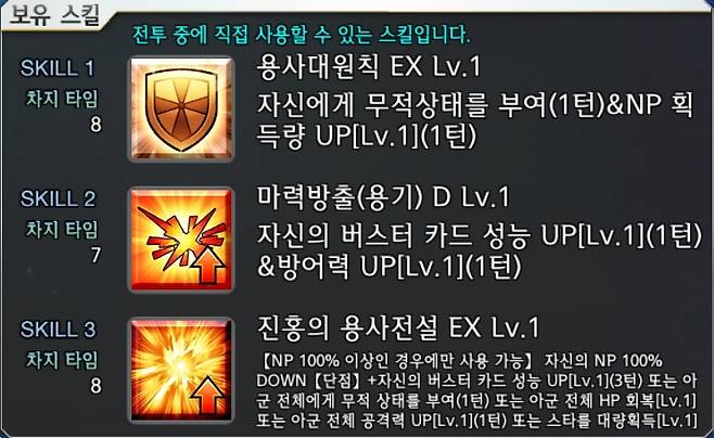 '용사대원칙'은 자신에게 무적 상태를 부여하며 NP 획득량이 증가한다. 때문에 적의 강력한 공격이 올 타이밍에 사용할지, 자신의 NP를 충전해야 하는 타이밍에 사용해야 할지 선택이 필요하다. '마력방출(용기)'는 자신의 버스터 카드 성능과 방어력을 상승시키는 스킬로, 적의 강력한 공격이 올 타이밍에 사용할지, 자신의 보구 타이밍에 사용할지 선택이 필요하다.