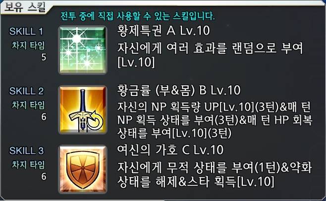 '황금률(부&몸)'은 3턴간 NP 획득량이 상승하며 매 턴 NP를 자동으로 충전하며, 매 턴 HP가 회복한다. 단기적인 효과는 적으나 장기전의 경우 보구 사용을 원활하게 만들며 생존성을 올려주는 매우 우수한 스킬이라고 할 수 있다.