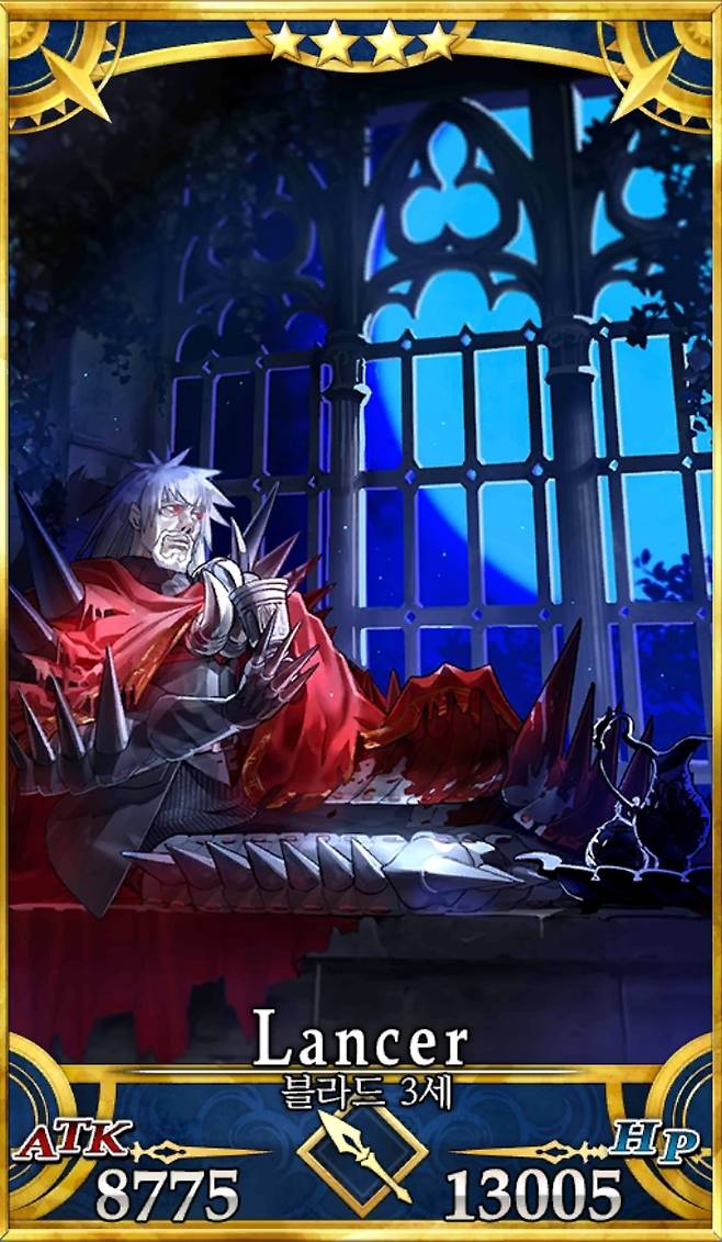 '군략'은 아군 전체의 보구 위력을 상승시키며 '무고의 괴물'은 매 턴 크리티컬 스타를 획득하고 자신에게 타깃 집중 상태를 부여한다. 이러한 '블라드 3세(엑스트라)'의 사용의 핵심은 스킬 '신앙의 가호'이다. 탱커로서 사용할 때는 '신앙의 가호'와 '무고의 괴물'을 동시에 사용하면 안전하게 아군을 지킬 수 있으며, 딜러로서 사용할 때는 '신앙의 가호'와 '군략'을 함께 사용하면 매우 큰 공격력의 보구 효과를 볼 수 있다.