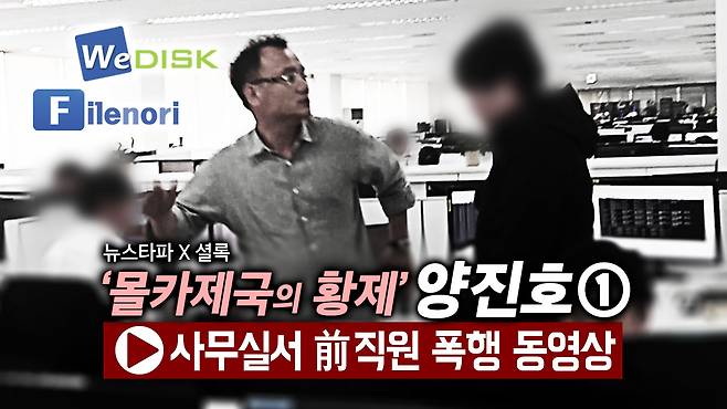 국내 웹하드 업계 1, 2위 업체인 위디스크와 파일노리의 실소유주이자 최근 디지털성범죄 사건에 연루돼 경찰 수사를 받고 있는 양진호 한국미래기술 회장이 전직 직원을 무차별 폭행한 영상을 뉴스타파가 확보했다.