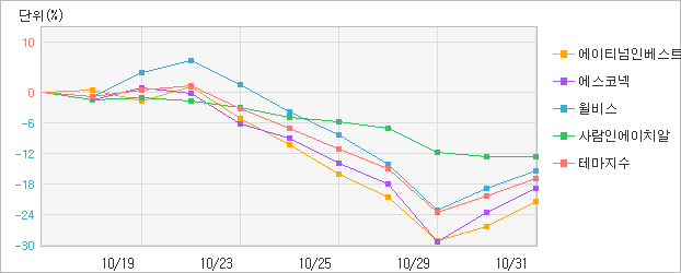 | 일자 | 윌비스 | 에이티넘인베스트 | 에스코넥 | 사람인에이치알 | 테마지수 |
