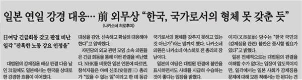 조선일보는 먼저 고노 다로 외무상의 "한·일 관계에 영향이 없을 수 없다"는 반응을 짧게 전한 후 "자민당의 외교 관련 모임 소속 의원들은 긴급 회동을 통해 이번 판결을 비난했다"며 '자민당 의원들의 회동 반응'까지 타전했습니다. 그러면서 "이 모임에서 2008년부터 1년간 외무상을 역임한 나카소네 히로후미 의원"의 "청구권 협정을 뒤엎는 것은 국제 상식에서 있을 수 없다", "한국은 국가로서의 형체를 갖추지 못하고 있는 것 아닌가"라는 발언을 전했습니다. 한국에 대한 명백한 모욕 발언, 망언이지만 그런 지적은 단 한 줄도 없습니다. 대신 "입헌민주당의 나가쓰마 아키라 대표대행"의 "유감이다. 하지만 의연하게 대응할 필요가 있다"는 발언 등 다른 일본 정당의 반응들을 덧붙였을 뿐입니다.