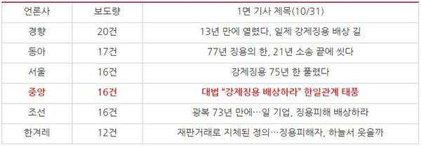 | ▲ 10/31~11/1 강제징용 손해배상 판결 관련 보도량과 31일 1면 머리기사 제목 |