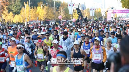 '달리자 나답게'를 표방하는 마라톤 축제 '2018 JTBC 서울마라톤'이 4일 잠실 종합 운동장에서 열렸다. 참가 선수들이 잠실 종합운동장 사거리에서 출발하고 있다. '2018 JTBC 서울마라톤'은 국내외 엘리트 선수는 물론 휠체어 부문, 아마추어, 10km 부문까지 약 2만 여명의 시민들이 참석했다. JTBC, JTBC3 FOX Sports를 통해 4일 오전 7시 45분부터 생중계된다.