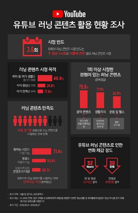 유튜브가 시장조사 전문기업 엠브레인을 통해 지난 8월 21일부터 27일까지 유튜브 시청 경험이 있는 15~69세 1000명을 대상으로 조사한 결과, 평균적으로 이틀에 한 번 꼴로 유튜브 내 러닝 콘텐츠를 시청하는 것으로 나타났다. 응답자들의 유튜브 러닝 콘텐츠 시청 빈도는 주 평균 3.6회를 기록했다. 연령대별로 60대가 주 평균 4회로 가장 높은 시청 빈도였다.