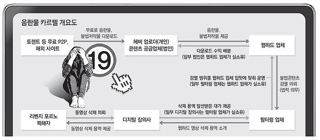 더 나아가 웹하드 업체가 실소유주인 필터링 업체는 인터넷에 떠도는 리벤지 포르노를 지워주는 디지털 장의사와 결탁해 수익을 낸다. 리벤지 포르노 피해자가 ‘웹하드 영상을 지워달라’고 요구하면 필터링 업체가 특정 디지털 장의사를 소개해주고 금전적 대가를 챙기는 방식이다. 피눈물을 흘린 리벤지 포르노 피해자의 돈이 영상을 유포한 웹하드 업체로 돌아가는 구조인 셈이다. 국내 최초 디지털 장의사인 김호진 산타크루즈컴퍼니 대표는 “웹하드 업체가 필터링 업체와 결탁해 ‘인터넷에서 특정 동영상을 자동으로 삭제해주는 기술을 제공할 테니 삭제 의뢰가 들어온 리벤지 포르노 원본을 달라’고 요구해 와 거절한 적도 있다”고 말했다.