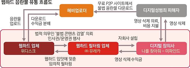 웹하드 카르텔은 웹하드 업체가 유통을 통제하는 필터링 업체, 디지털장의사 업체와 유착해 불법 촬영물로 막대한 이익을 버는 구조를 의미한다.