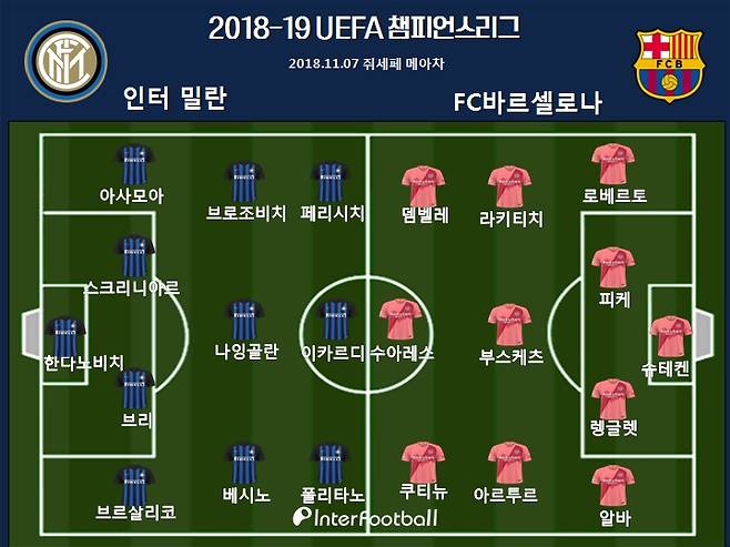 인터 밀란은 7일 오전 5시(한국시각) 이탈리아 밀라노의 쥐세페 메아차에서 열린 2018-19 유럽축구연맹(UEFA) 챔피언스리그(UCL) 조별리그 4차전에서 바르셀로나와 1-1 무승부를 거뒀다.