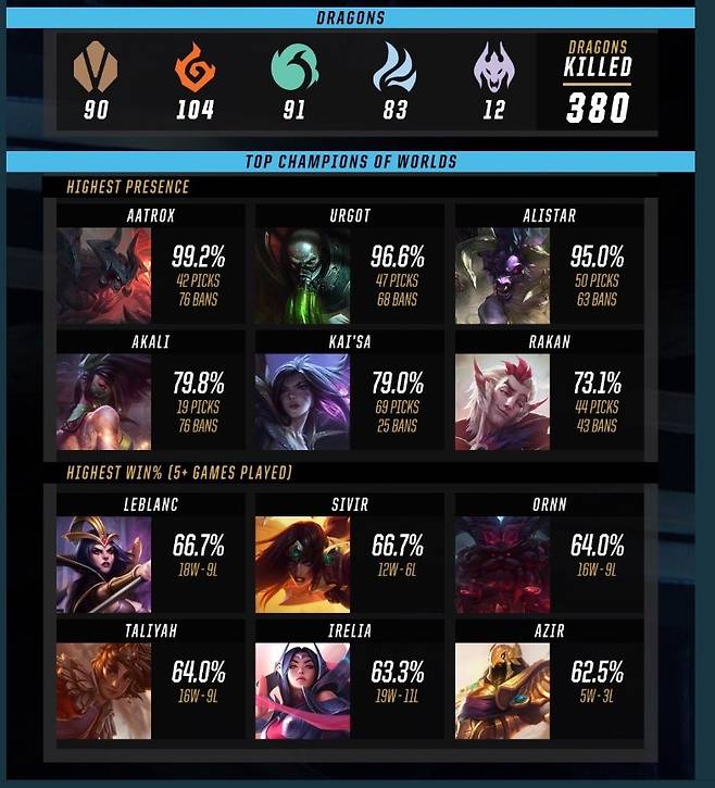 5번 이상 플레이된 챔피언들 가운데 승률이 높았던 챔피언은 르블랑과 시비르, 오른이다. 이번 롤드컵이 공격적이면서도 손이 많이 가는 챔피언을 누가 잘 다루느냐에 따라 승패가 결정됐다는 분석이 나올 만큼 미드 라이너의 피지컬 싸움이 대단했는데 르블랑을 어떤 팀이 얼마나 잘 썼느냐에 따라 희비가 엇갈렸다고 해도 과언이 아니다. 르블랑은 18승9패를 기록하면서 12승6패의 시비르와 똑같이 66.7%의 승률을 보유했다. 3위에 랭크된 오른은 8강 이상에서는 거의 나오지 않았으나 플레이-인 스테이지와 그룹 스테이지에서 좋은 활약을 펼치면서 16승9패, 64%의 승률을 기록하며 탈리야, 이렐리아, 아지르 등과 비슷한 승률을 올렸다.