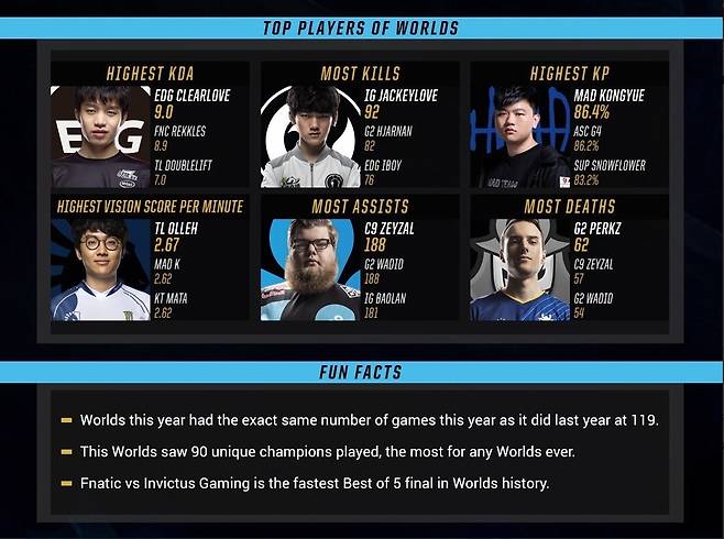선수별 기록도 공개됐다. 가장 높은 KDA(킬과 어시스트를 더한 뒤 데스로 나눈 수치)를 기록한 선수는 에드워드 게이밍의 정글러 'Clearlove' 밍카이로, 9.0을 기록했고 프나틱의 원거리 딜러 'Rekkles' 마틴 라르손이 8.9, 리퀴드의 'DoubleLift' 일리앙 펭이 7.0으로 그 뒤를 이었다.