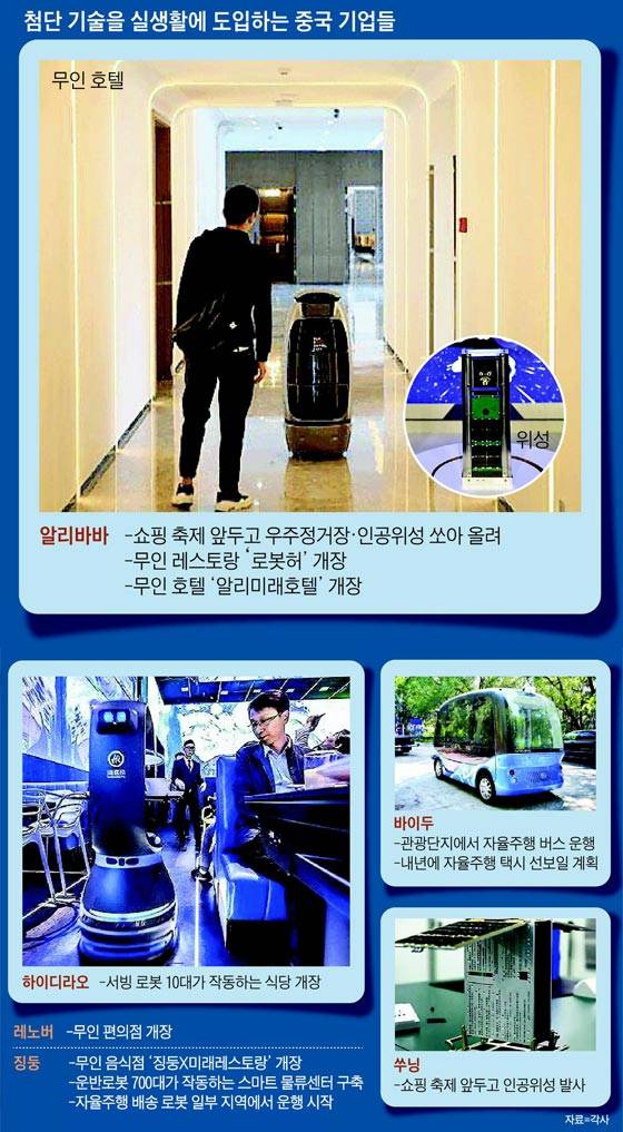중국 2위 전자상거래 업체 징둥은 29일 톈진에서 100석 규모의 스마트 식당 '징둥×미래레스토랑'을 개장했다. 이 매장에는 3개의 서빙 로봇이 일하고 있다. 중국 IT 업체 레노버는 6일 베이징에 스마트 결제 시스템이 장착된 무인 편의점을 열었다. 상주하는 직원 하나 없이 로봇이 체크인과 안내를 도맡아 하는 호텔도 생겼다.