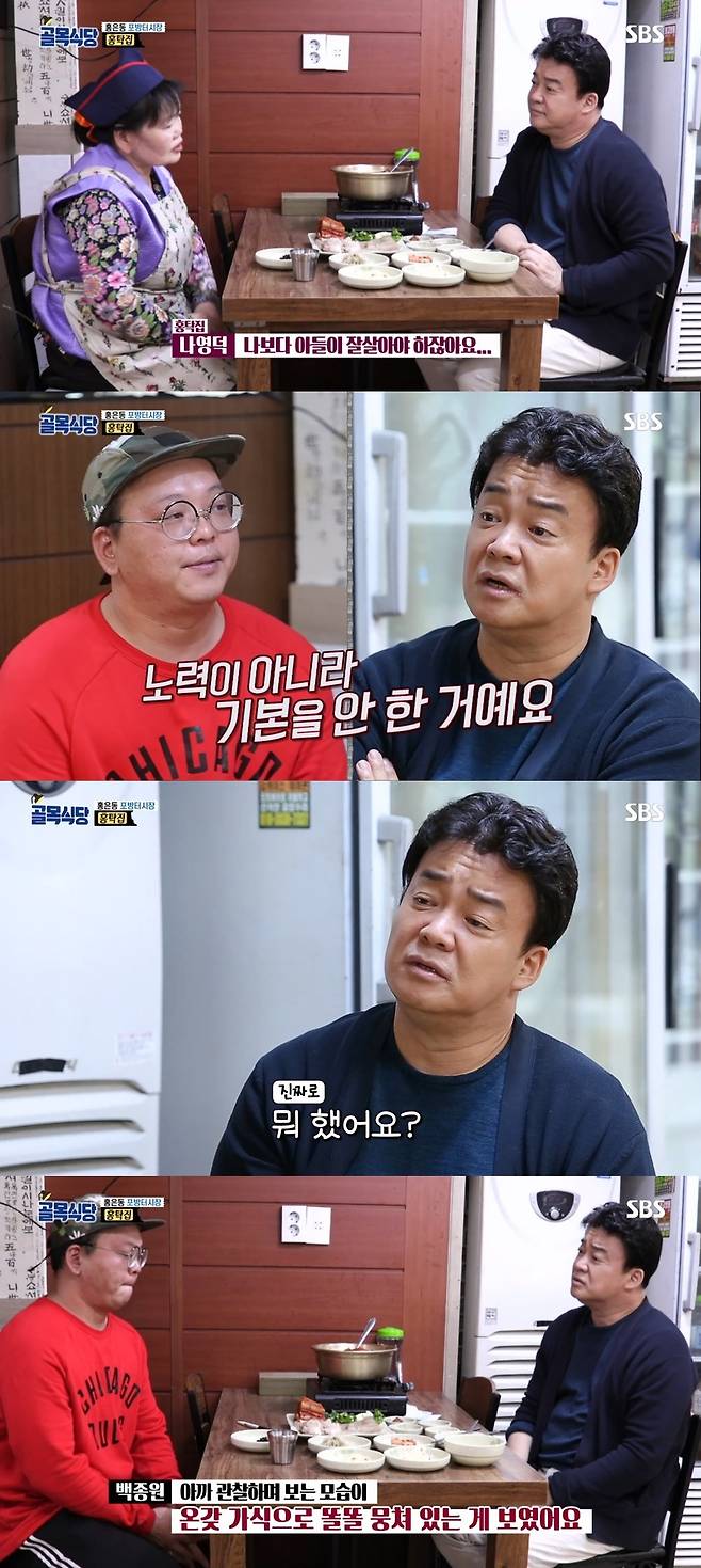 요리가 나온 후 백종원은 어머니와 마주앉았다. 어머니는 뚜렷한 직장이 없는 아들과 4년 전 식당을 시작하게 된 이유, 남편 없이 홀로 어린 아들을 키워야 했던 사연 등 속사정을 털어놨다. 백종원은 어머니의 눈물에 "잘 될거다. 걱정하지마라"고 달래며 "여기는 식당도 살려야 하지만 아들 교육이 필요하다. 어떡하든 해보자"고 말했다.
