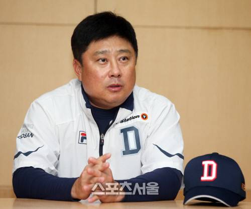 두산 김태형 감독이 8일 인천 SK행복드림구장에서 기자들의 질문에 답하고 있다.