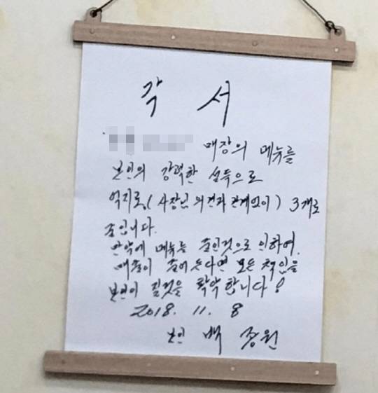 현재 돈가스 집은 백종원의 설득으로 총 21가지의 메뉴를 3가지로 줄이면서 백종원에게 특별한 선물을 받았다. 오늘 방문한 손님들이 SNS에 공개한 사진에는 "본인의 강력한 설득으로 억지로(사장님 의견과 관계없이) 메뉴를 3개로 줄입니다. 만약에 메뉴를 줄인 것으로 인하여 매출이 줄어든다면 모든 책임을 본인이 질것을 확약합니다. 본인 백종원"라고 서명과 함께 족자에 걸린 백종원의 각서가 가게 벽에 붙어 있어 눈길을 끌고 있다.