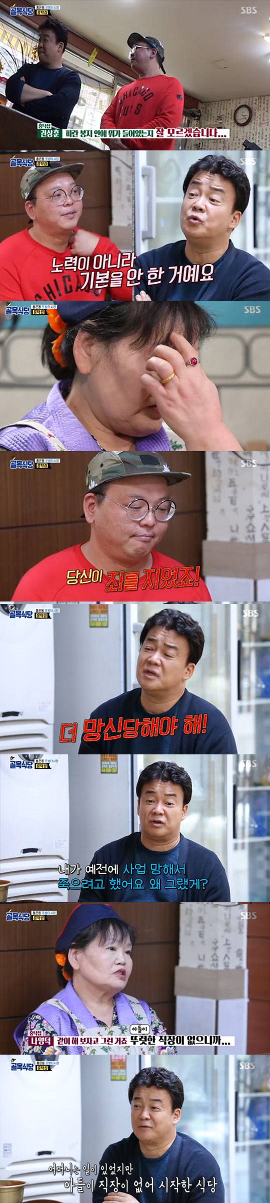 백종원은 4년간 어머니를 도와 식당을 운영 했다면서 냉장고 봉투에 뭐가 들었는지 재료가 어디에 있는지도 모르는 아들에게 "노력이 아니라 기본도 안 했다"고 비판하고, 사업자 등록 명의는 본인 이름으로 갖고 있는 아들에게 "가식으로 똘똘 뭉쳤다. 더 망신 당해야한다"고 목소리를 높였다. 또한 자신의 과거 사업 실패 이야기를 고백하면서 "나도 과거에 사업 망해서 죽으려 했었다. '왕년에...' 다 필요없다. 엄마가 뭔 죄를 지어서 울어야 하느냐. 당신은 변명할 거리가 없다. 나한테 스스로를 증명할 방법을 찾아라"라고 일침을 놓았다.