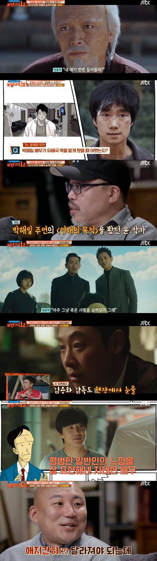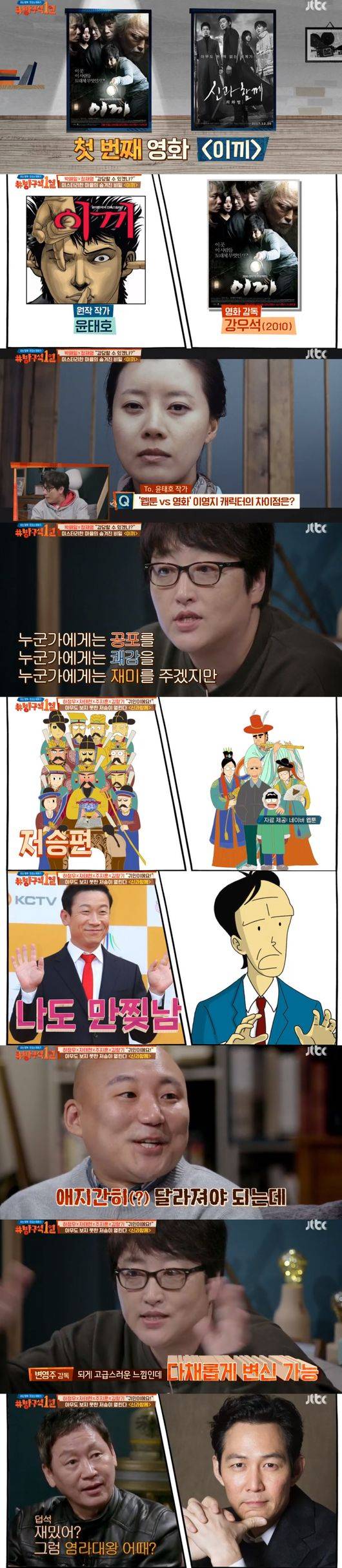 9일 전파를 탄 JTBC '방구석 1열' 28회에서 웹툰을 원작으로 한 강우석 감독의 영화 '이끼'와 김용화 감독의 '신과 함께'를 키워드로 '띵작매치'가 진행됐다. 원작 웹툰인 '이끼'의 윤태호 작가와 '신과 함께'의 주호민 작가, '신과 함께'를 만든 원동연 제작자가 방구석 멤버로 출연했다.