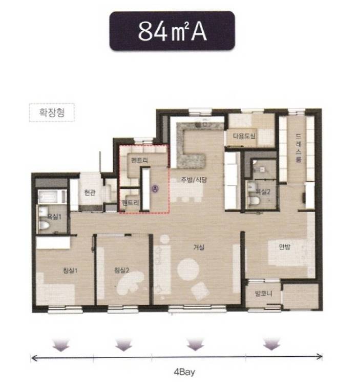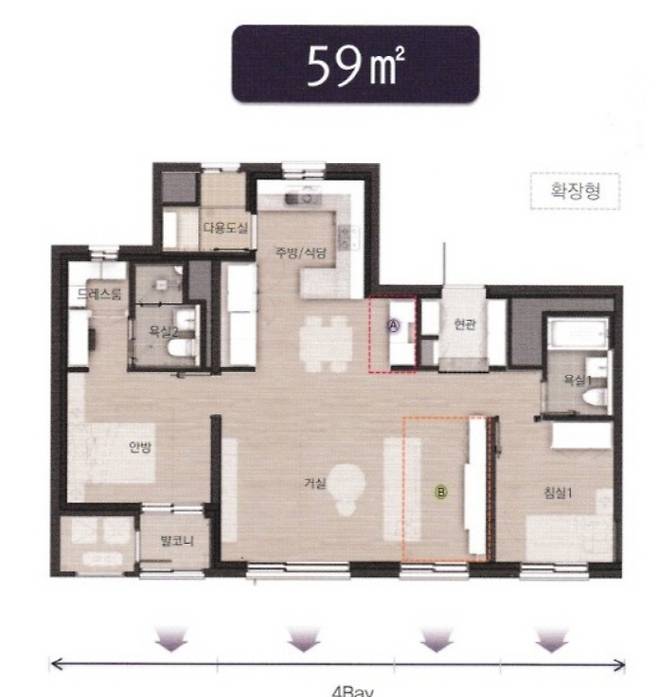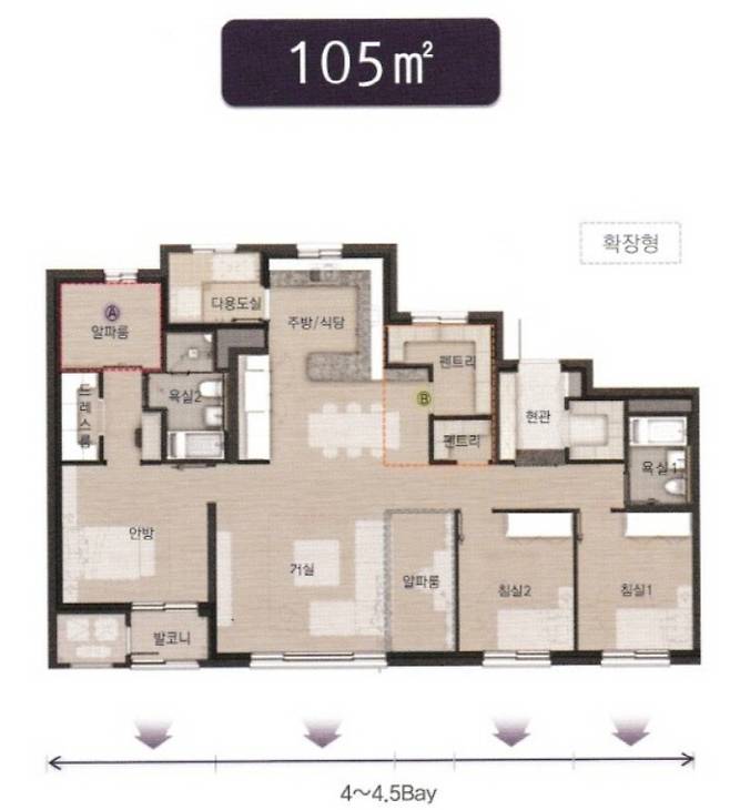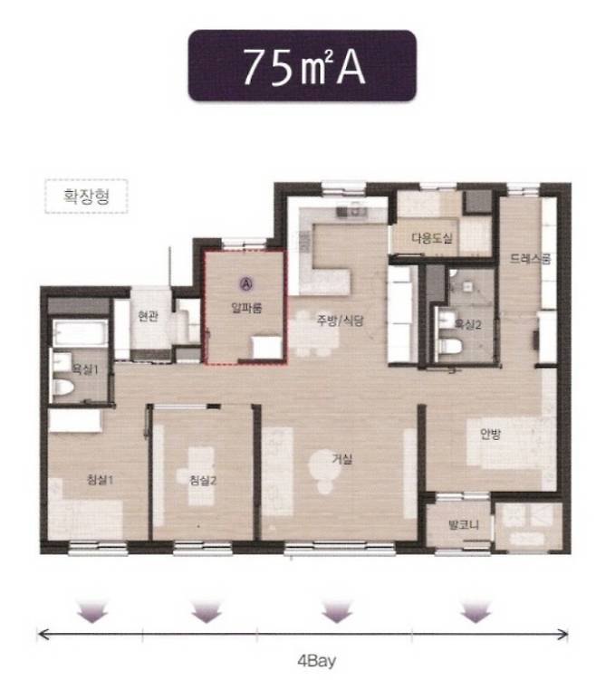 전용면적별로 △59㎡ 218가구 △75㎡A 246가구 △75㎡B 200가구 △84㎡A 1310가구 △84㎡B 218가구 △84㎡C 329가구 △105㎡ 142가구 △134㎡P 3가구며 전용면적 85㎡ 이하 중소형이 전체의 90%이상을 차지한다.