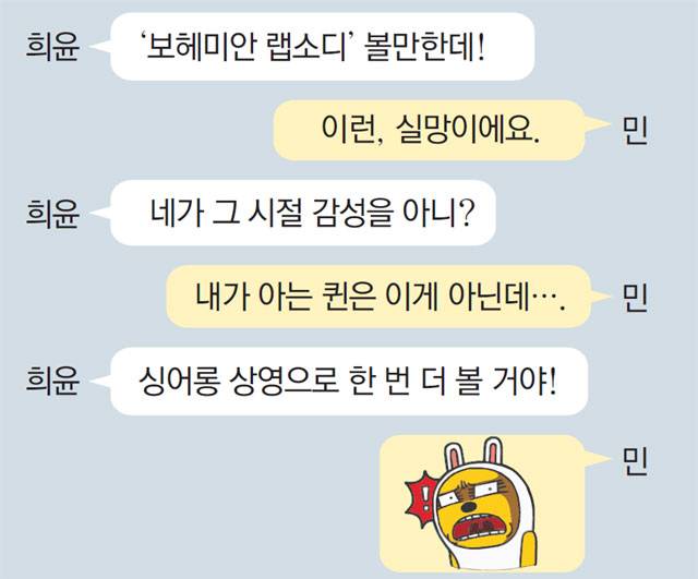 ▽김민=퀸을 사랑하는데 이 영화를 좋아할 수 있다니! 같이 비판할 줄 알았는데 실망이야.