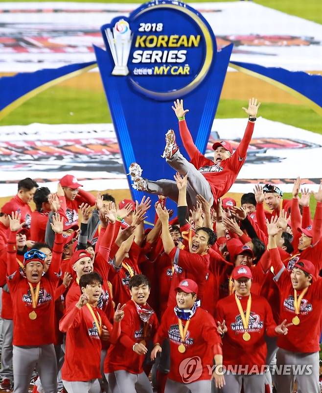 (서울=연합뉴스) 홍해인 기자 = 12일 오후 서울 잠실야구장에서 열린 2018 프로야구 한국시리즈 두산 베어스와의 6차전 경기에서 승리하며 우승을 차지한 SK 와이번스 선수들이 시상식에서 트레이 힐만 감독을 헹가래 하고 있다. 2018.11.13