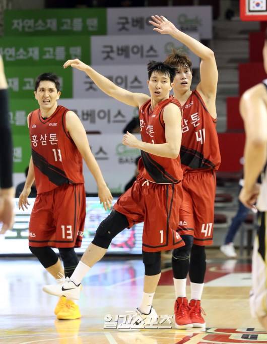 ‘2018~2019 SKT 5GX 프로농구’ 안양 KGC와 창원 LG의 경기가 13일 오후 안양실내체육관에서 열렸다. KGC 이민재가 4쿼터 3점슛을 성공시키고 동료들과 환호하고있다. 안양=정시종 기자 jung.sichong@jtbc.co.kr /2018.11.13.