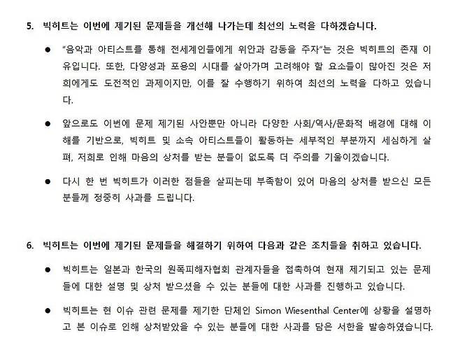 이에 대해 빅히트 측은 "원폭 이미지가 들어있는 의상 착용과 관련해 일체의 의도가 없었고 의상 자체가 원폭 피해자 분들에게 상처를 드릴 목적으로 제작된 의상이 아닌 것으로 확인됐음에도 당사가 사전에 충분한 검수를 못하여 당사의 아티스트가 착용하게 됨으로 인해 원폭 피해자 분들께 의도하지 않게 상처를 드릴 수 있었던 점은 물론, 당사 아티스트가 원폭 이미지와 연계돼 있는 모습에 불편함을 느끼셨을 수 있었던 점에 대해 진심으로 사과드린다"고 밝혔다.