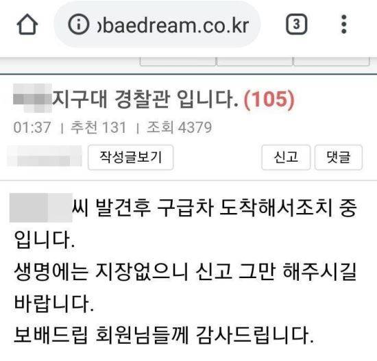 또 적지 않은 보배드림 회원들이 경찰에 신고했습니다. 글이 올라온 지 한 시간 뒤인 새벽 2시쯤, 자신을 대구의 한 지구대 소속 경찰관이라고 밝힌 네티즌이 “발견 후 구급차 도착해서 조치 중이고 생명에는 지장이 없으니 신고를 그만해 달라”고 적었습니다. 경찰관은 보배드림 회원들에게 감사 인사를 남겼습니다.