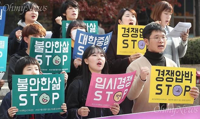 | ▲ “줄 세우기를 멈추자” 2018학년도 대학수학능력시험이 치러진 15일 오전 서울 종로구 광화문사거리 앞에서 ‘대학입시 거부로 삶을 바꾸는 투명가방끈’ 소속 회원과 대학입시거부를 선언한 청년, 차별금지법제정연대, 촛불청소년이권법제정연대 회원들이 입시경쟁과 학벌사회를 비판하며 행진을 벌이고 있다. |