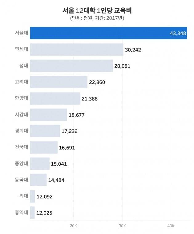 서울 주요 13개 대학 중 1인당 교육비가 가장 높은 학교는 서울대학교입니다. 1년에 학생 1명 당 무려 4334만원을 쓰는군요. 2018년 서울대 1년치 등록금은 601만원입니다. 학교 입장에선 등록금을 제외한 3700만원을 학생에게 더 투자한 셈이군요. 그렇다면 서울대는 나머지 3700만원 교육비를 어디에서 구했을까요? 교육부의 정부지원금이 그만큼 국공립에 투여된다는 뜻입니다.