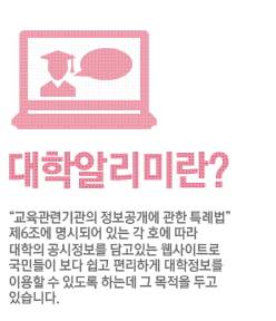 이외 대학 정보, 국민의 교육 정보 알 권리를 보장하기 위해 개설된 '대학알리미'에 접속하면 417개 공시 대상 학교의 정보를 모두 확인할 수 있습니다.