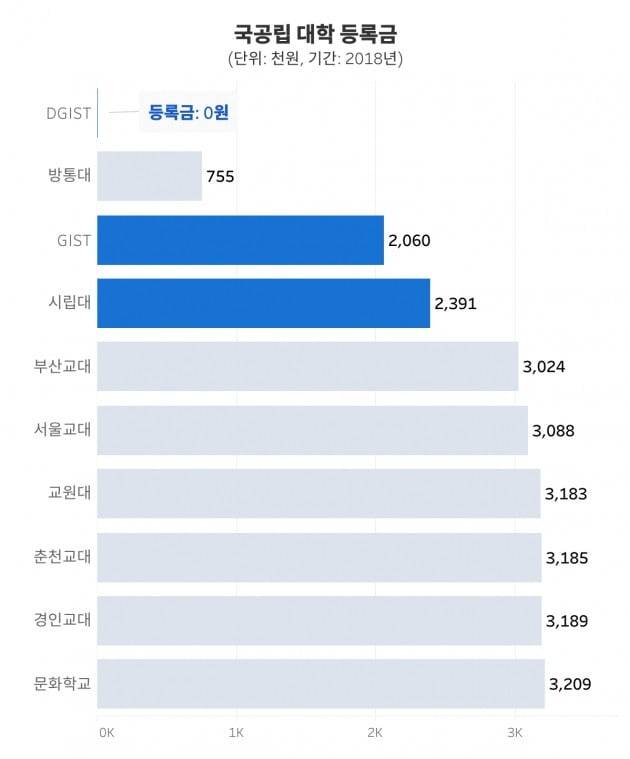 전국에서 등록금이 가장 저렴한 대학은 어디일까요? 바로 '대구경북과학기술원'입니다. DGIST(Daegu Gyeongbuk Institute of Science and Technology)라고도 불리는 이곳은 국립대 중에서도 등록금이 가장 싼 학교입니다. 2017년 1354명의 재학생 모두 등록금이 0원이었습니다. 사립대학 중에서는 광주가톨릭대학교의 등록금이 0원입니다.