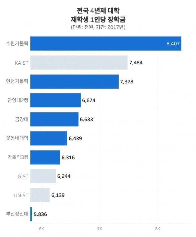 장학금을 많이 주는 대학은 종교재단이 운영하는 대학, 그리고 과학 중심의 과학기술원들입니다.