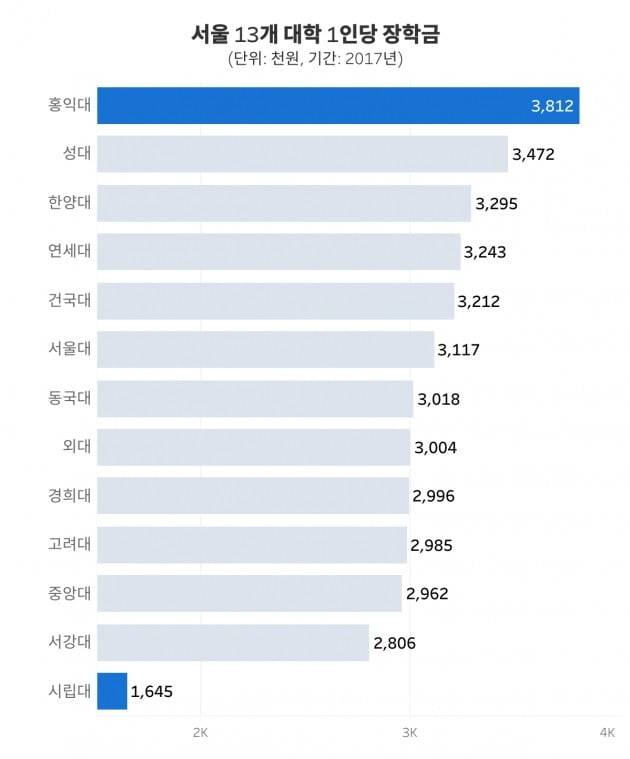 위 인터랙티브 그래프 내 13개 대학에 포함하진 못했지만 서울 시내 학생 수 1만 명 이상인 학교로 대상을 넓히면 세종대학교, 이화여자대학교, 숭실대학교, 국민대학교도 장학금 순위가 높은 편입니다. 2017년 한 해 동안 373만원, 338만원, 328만원, 315만원의 1인당 장학금을 각각 줬습니다.